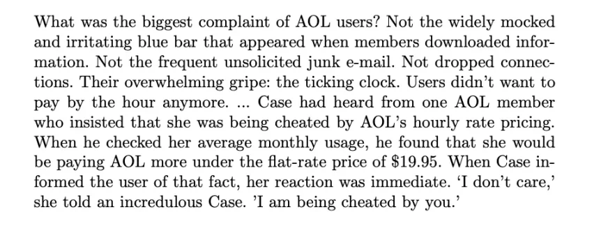 他们按小时收取拨号上网费用。对大多数用户来说,这客观上比固定费率订阅更便宜。然而,客户讨厌它,因为这会带来精神负担。在线的每一分钟都感觉像计价器在跑,每次点击都带着微小的成本。人们忍不住将每个微成本记作一次「损失」,即使金额很小。每次点击都变成了一个微观决策:这个链接值 0.03 美元吗?