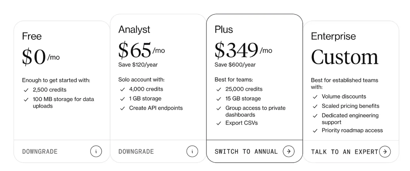 这就是为什么以席位为主导的产品一直在悄悄转向计量模式。保留用于协作和支持的基础计划,但对重负载收费。例如,Dune 每月提供有限的积分。小型、简单的查询很便宜,而运行时间较长的大型查询则消耗更多积分。