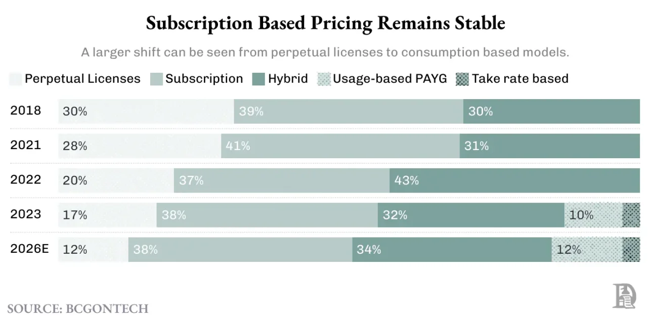 云服务将每毫秒计费标准化用于计算、数据,而 API 平台销售随实际工作缩放的积分。它正朝着将收入与网络能观察到的最小单位挂钩的方向发展。2018 年,不到 30% 的软件采用基于使用的定价。如今,基于使用的定价通过侵蚀基于佣金的定价,占比接近 50%,而订阅仍以 40% 占据主导地位。