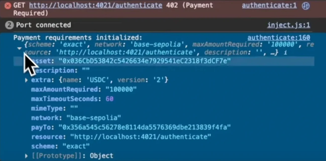 想象一下 Substack 对一篇优质文章收费 0.50 美元。当你点击「付费阅读」按钮时,Substack 返回一个 402 代码,其中包含价格、接受的资产(例如 USDC)、网络(例如 Base 或 Solana)和策略。看起来像这样: