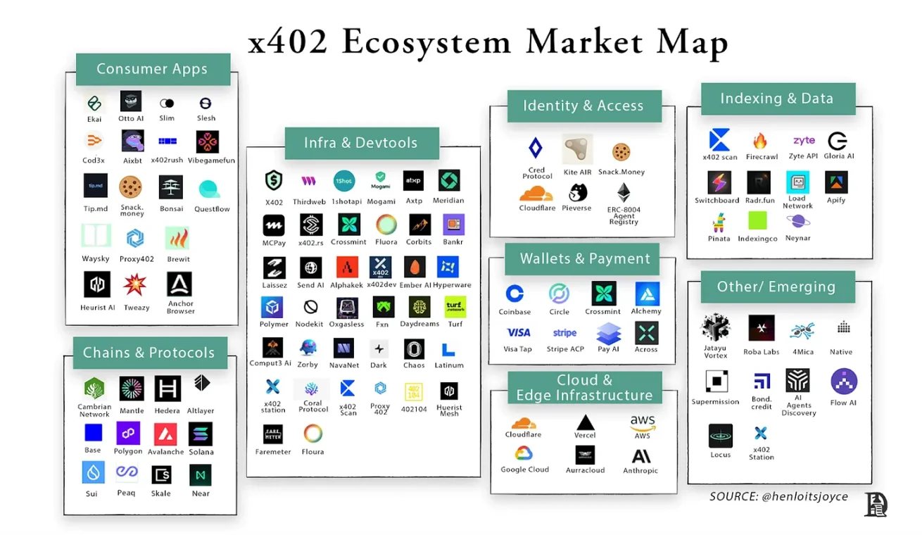 关于 x402 有趣的部分是,目前它不是一个单一的实体;它由你在真实基础设施中期望找到的各个层组成。任何通过 Cloudflare 的 Agent Kit 构建 AI 代理的人都可以创建按操作定价的机器人。像 Visa 和 PayPal 这样的支付巨头也在将 x402 添加为支持的基础设施。