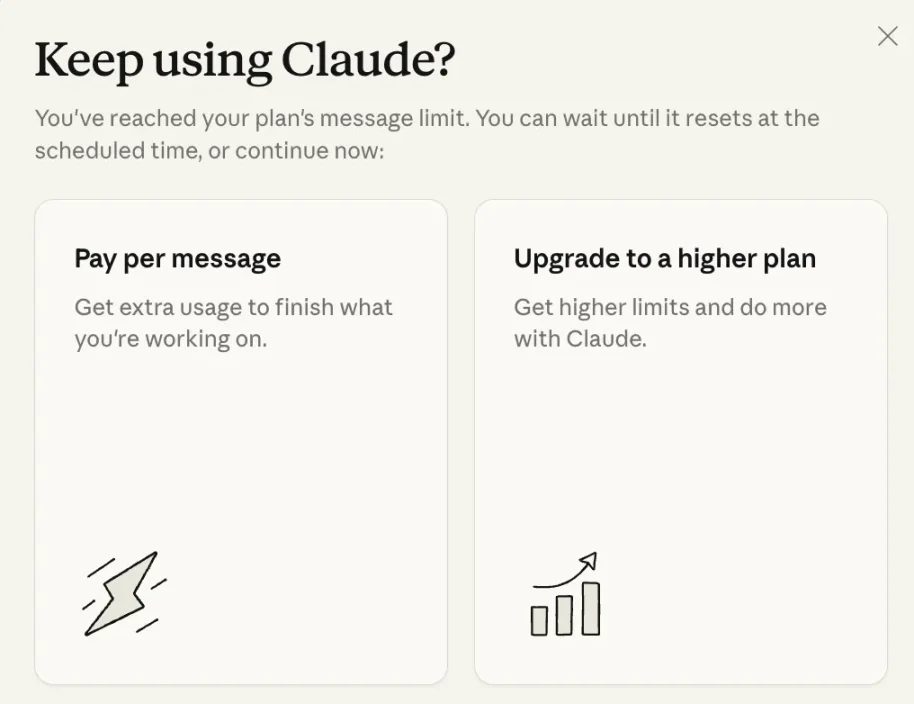 你已经可以看到消费者 AI 正朝着这个方向迈进。当你达到 Claude 的消息限制时,它不只是说「达到限制,下周再来。」它在同一屏幕上提供两条路径:升级到更高订阅,或按每条消息付费以完成你正在做的事情。
