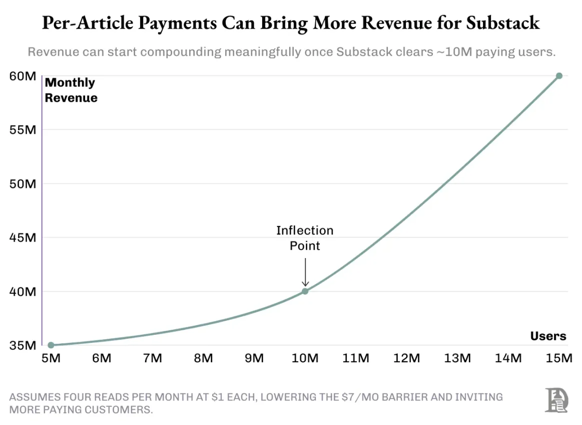 Substack 有 5000 万用户,转化率为 10%,这就意味着 500 万订阅者每月支付约 7 美元。当付费订阅者基数翻倍达到 1000 万时,那可能就是 Substack 开始从小额支付中获得更多收入的时候。由于摩擦较低,更多随意读者可以转向为每篇文章付费,加速收入曲线。