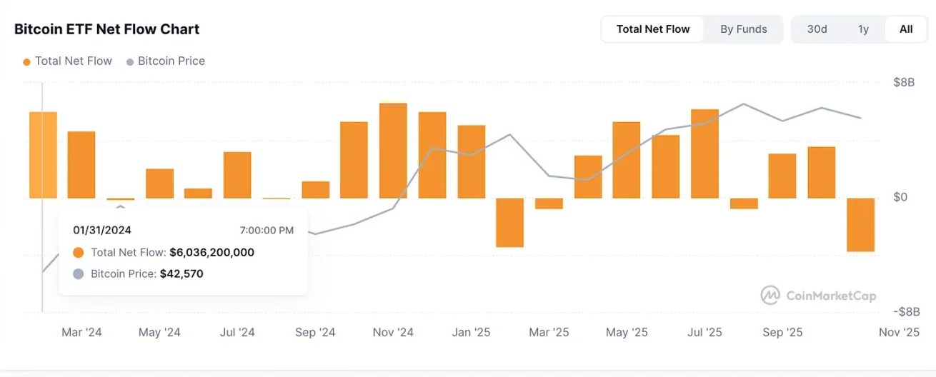 但仅看这幅图景并不完整。看看来自 CoinMarketCap 的这张图,它显示了自成立以来每月的净资金流。