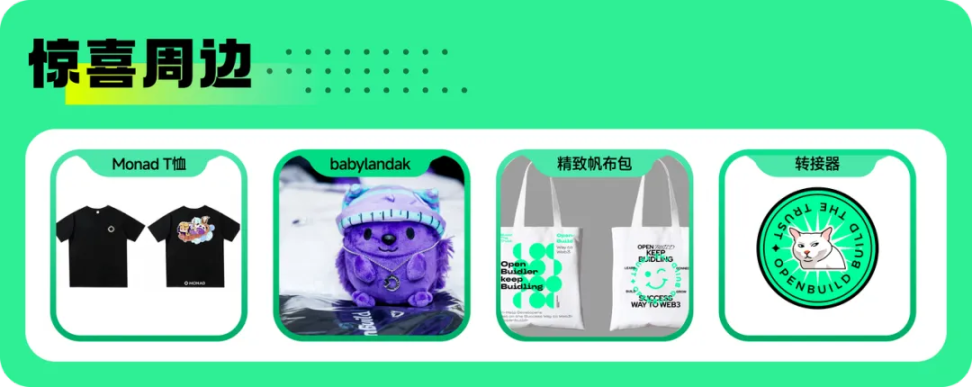 本次活动为大家特别准备了专属定制的 Monad 和 OpenBuild 周边好礼!从实用的 T 恤到可爱的公仔,更有时尚手链和新颖贴纸等你带回家!
