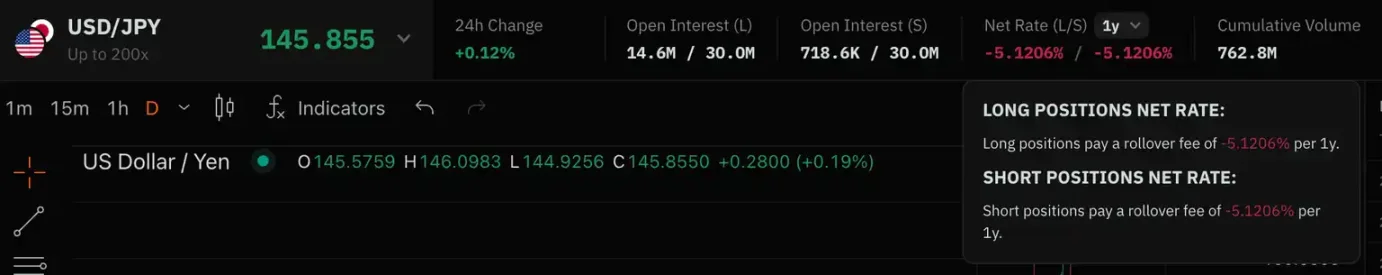 展期费会显示在净利率(L/S)标签上。将鼠标悬停在上面,会显示一个说明长短转期费用的工具提示