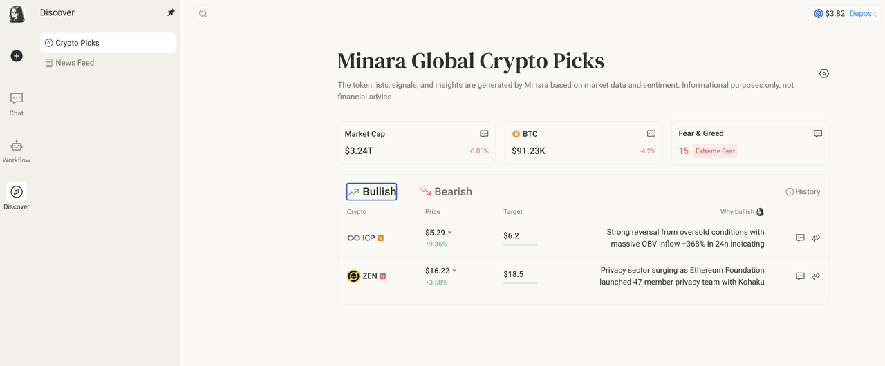 这种转变的意义在于: Minara 将一整支投资团队的功能装进了一个聊天窗口, 为用户提供专业洞察、策略和执行的完整支持 。用户获得了数据分析师的洞察、交易员的执行能力、风险管理员的建议,以及投资顾问的指导。