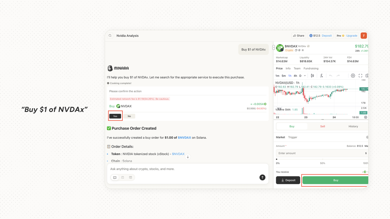 Minara 以“对话式入口”重新组织了数字金融中常见的碎片化操作。 无论是传统资产还是加密资产,用户过去需要在行情网站、数据平台、区块浏览器、社交媒体、钱包应用之间来回切换,才能完成一次完整的分析与操作;而在 Minara 中,数据理解、策略推导、风险提示与操作执行被整合进同一个聊天窗口; 而执行层能力目前主要集中在链上资产。