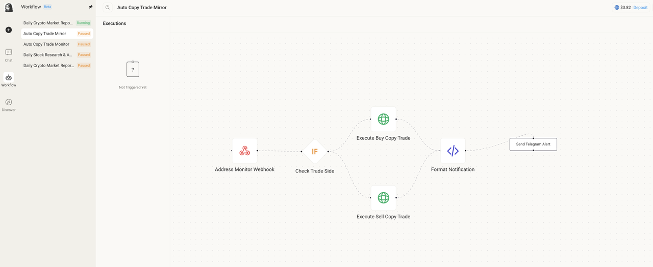 同时,Minara 的交易能力直接接入链上基础设施,使用户无需跳转到第三方应用即可完成很多交易相关(如:调仓、执行套利、限价单等)的操作,此外,Minara 还支持将自然语言直接生成自动化任务,让用户通过一句话就能搭建可持续运行的交易流程,这在当前的 Agent 中仍较为少见。