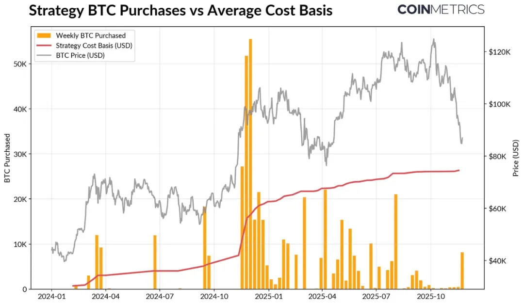 Strategy — — 当前最大的 DAT — — 持有 649,870 BTC(约占全供应的 3.2%),平均成本为 74,333 美元。如下图所示,Strategy 的增持在 BTC 上涨、其股价表现强劲时大幅加速,而近期则明显放缓,但并未成为主动出售力量。即便如此,Strategy 仍处于浮盈状态,成本低于现价。