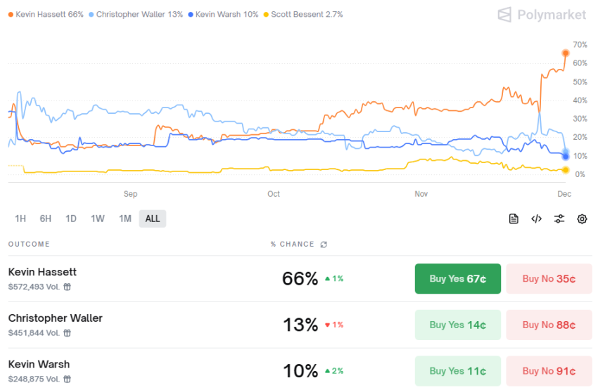 白宫国家经济委员会主任 Kevin Hassett(哈塞特)周日在接受媒体采访中强调,市场对特朗普即将宣布新主席人选的消息「反应非常非常积极」。作为特朗普首席经济顾问的哈塞特被视为接替鲍威尔的热门人选,目前在 polymarket 预测中以 66% 的概率领先。