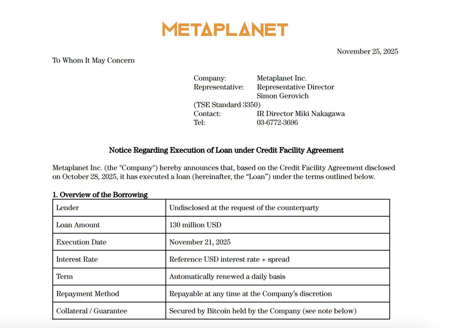 11 月 25 日,Metaplanet 这家日本上市公司公告称已根据信贷额度合同执行 1.3 亿美元的新借款,并以所持比特币作为担保。整个额度上限为 5 亿美元,算上本次借款,累计已借出 2.3 亿美元,用于后续再去市场上买入 比特币。简单来说就是,抵押比特币、获得现金、再去买入比特币,循环再循环。目前,公司账面仍持有 30,823 枚 比特币,足以覆盖担保需求。筹集资金计划用于追加购入比特币、推进比特币收入业务,甚至在市场允许时回购股票。Metaplanet 也强调,本次借款对 2025 年度业绩影响轻微。