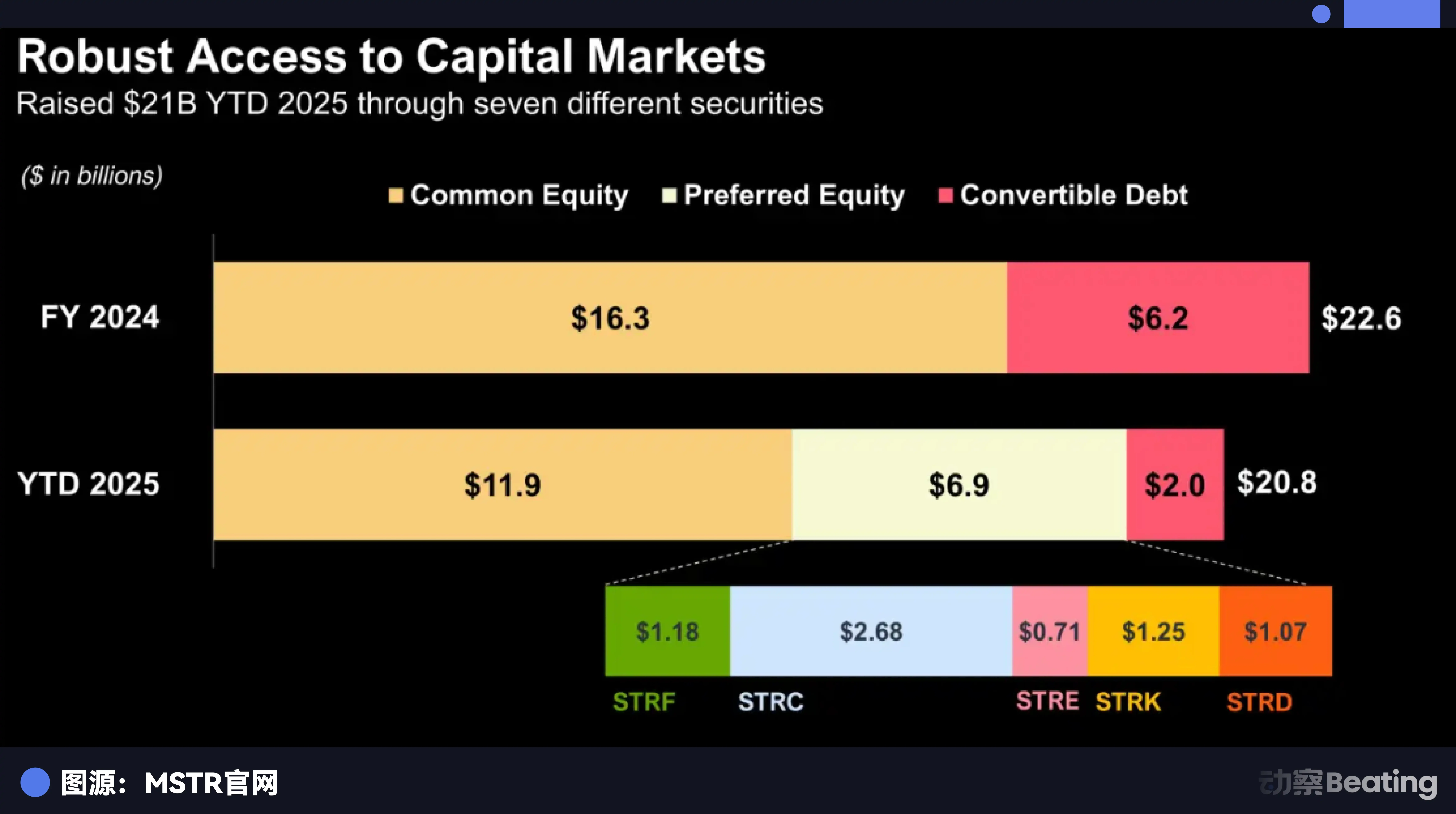 MSTR 今年已募得 208 亿美元的高额资金,这个规模在美国上市公司的年度募资中极为罕见。资金来源分别为普通股 MSTR 119 亿美元、优先股 69 亿美元、可转债 20 亿美元。