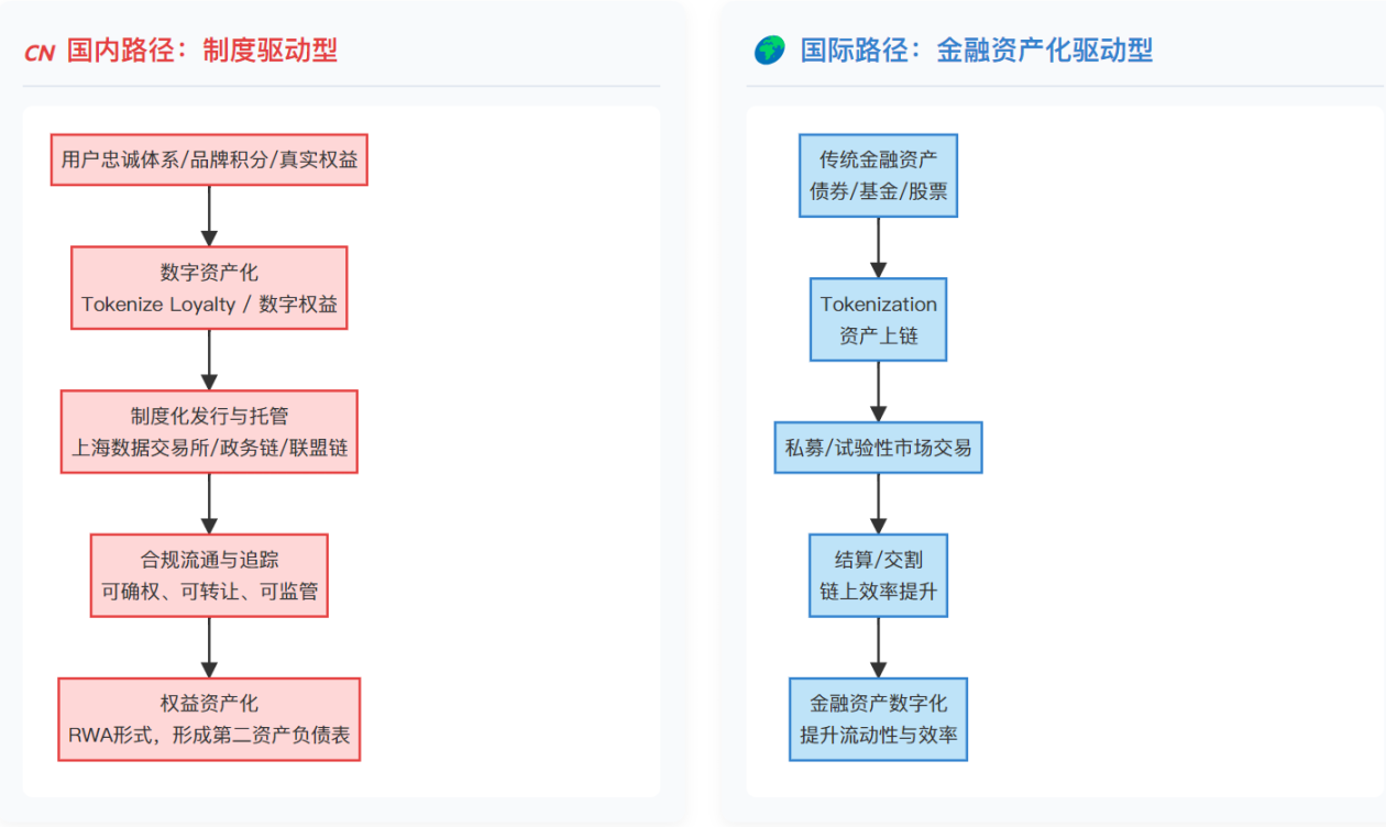 当我们把目光投向全球,会明显看到国内与海外在数字资产领域呈现两条完全不同的路径。海外以金融资产为核心,中国以消费权益为核心;海外是市场驱动,中国是制度驱动;海外依赖公链,中国沿着可监管链体系前行。