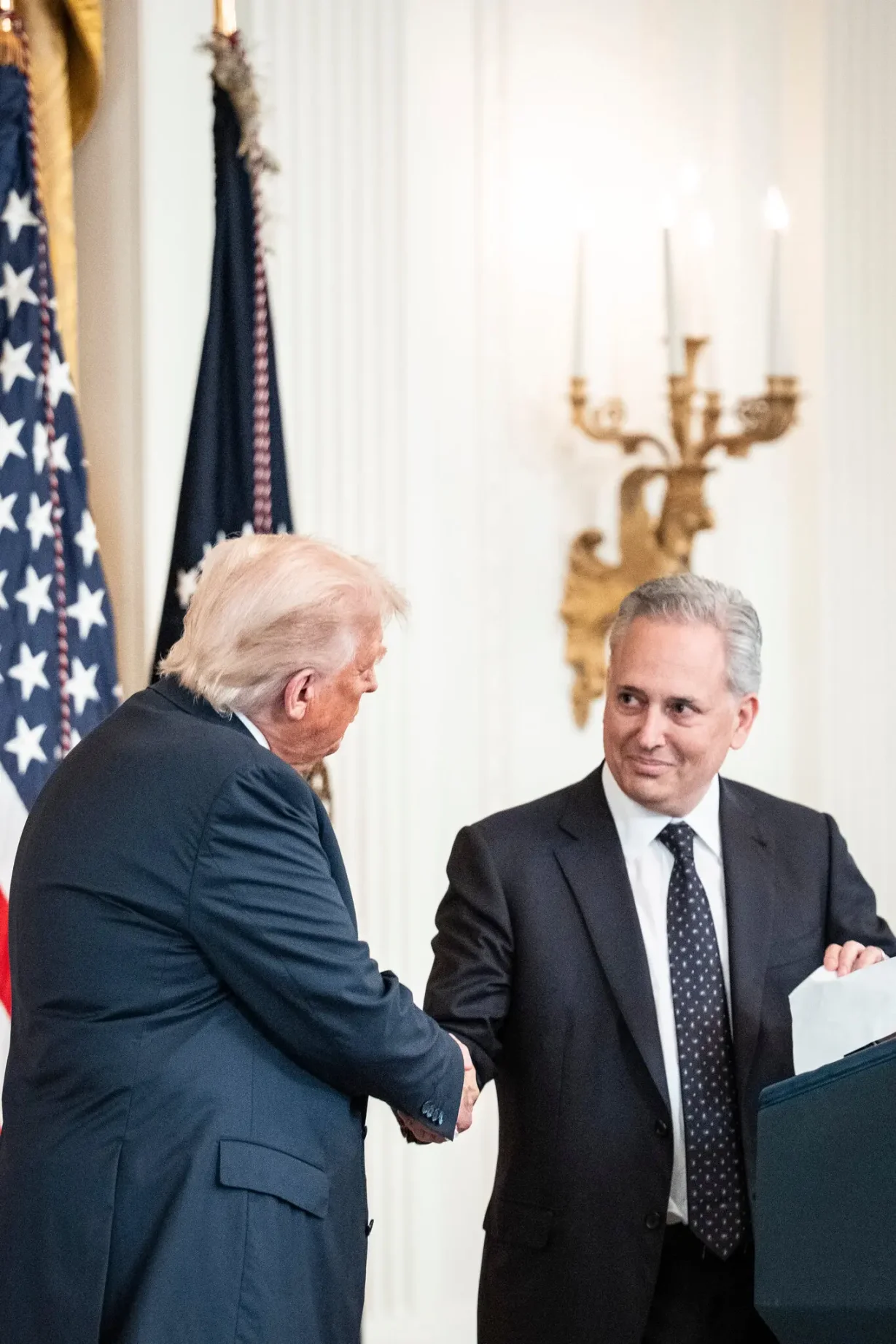 特朗普总统与 David Sacks 在一起,总统即将签署被 David Sacks 称为「重大」的《GENIUS 法案》。图片来源:Haiyun Jiang/The New York Times