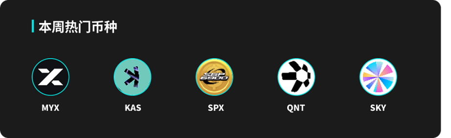 热门币种方面,MYX、KAS、SPX、QNT 和 SKY 都有着不俗的表现。