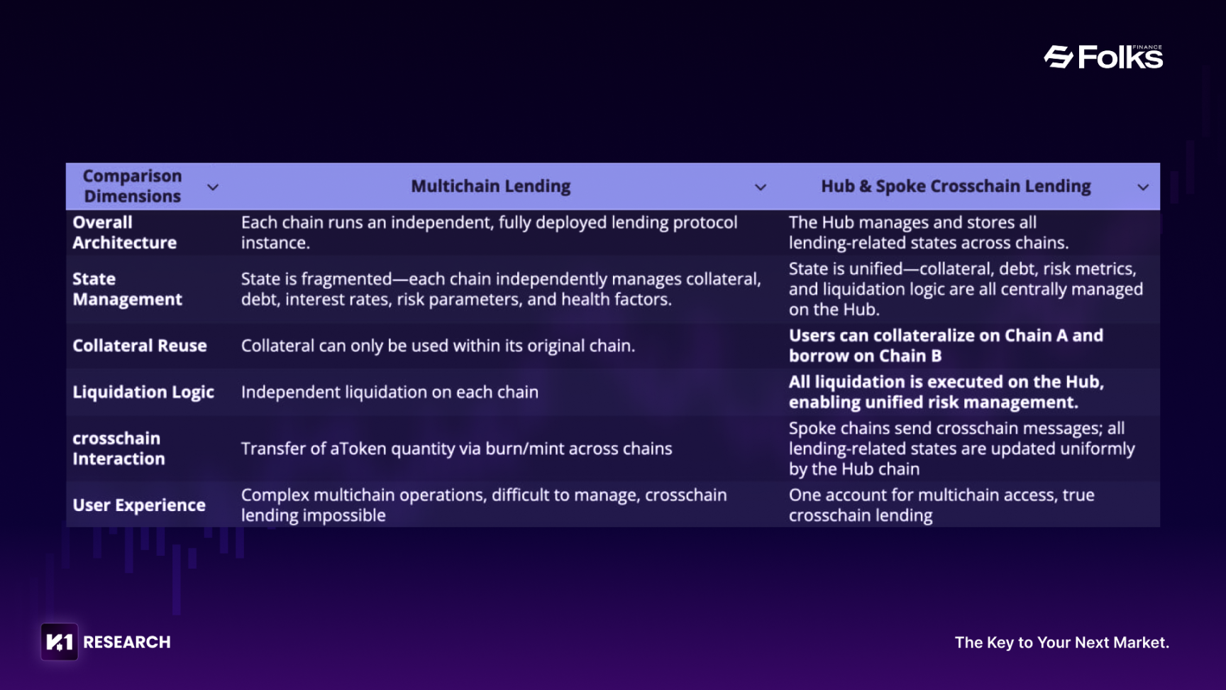 这样一来,协议在 状态层和风险引擎层是单一的、跨链共享的,可以实现在一条链上抵押,在另一条链上贷款;相比传统的多链多池流动性分散模式这种架构让不同链的用户共享同一套借贷系统,实现更高的资金效率、统一风险控制和真正的跨链借贷能力。