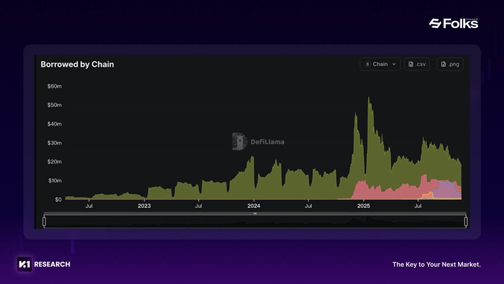 Folks Finance 于 2022 年 4 月在 Algorand 上线,最初借贷活动主要集中在其原生链上。从 2024 年年中开始,跨链借贷机制的引入使得借贷需求得以扩展到多个链。该机制有效地将资金分配到各个网络,使 Folks Finance 成为一个跨链借贷平台,而非单一链应用。此后,整体借贷规模已超过早期水平,反映了该协议在各个生态系统中的增长和应用。