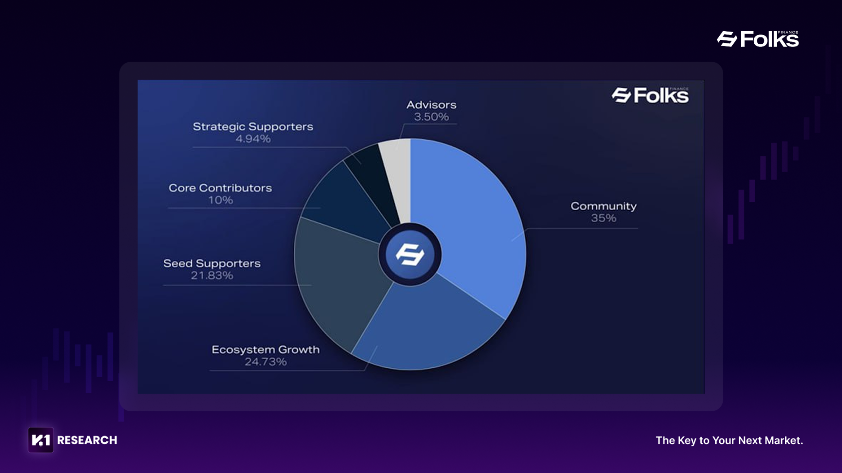 FOLKS 总供应量 5000 万枚,当前流通约 1220 万枚,初始 TGE 流通 1270 万枚,FDV 约 3.23 亿美元。社区与生态增长占比合计超过 50%,体现协议对用户与生态导向。