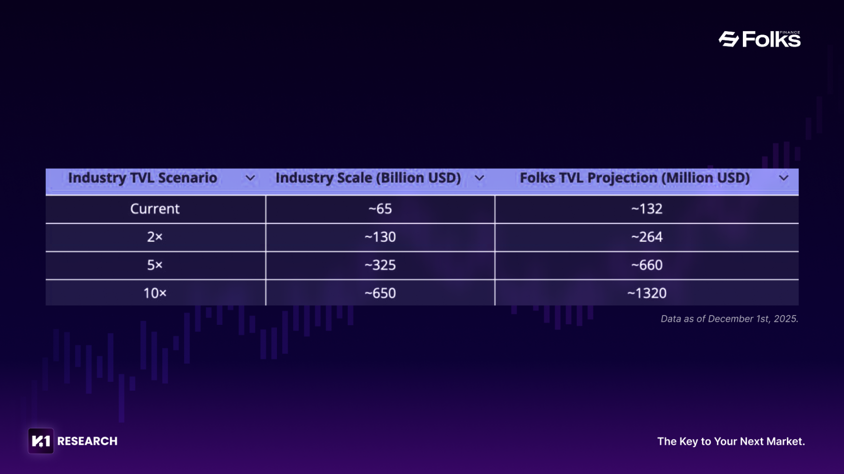 然而,由于 Folks 采用跨链借贷架构,其增长并不会严格沿线性路径展开。跨链模式能同时承接多条链的借贷需求,使资金利用率在结构上优于单链借贷;从而使“有效 TVL”在同等体量下更高。因此,在行业扩张的过程中,Folks 实际 TVL 的增速往往高于线性推算。