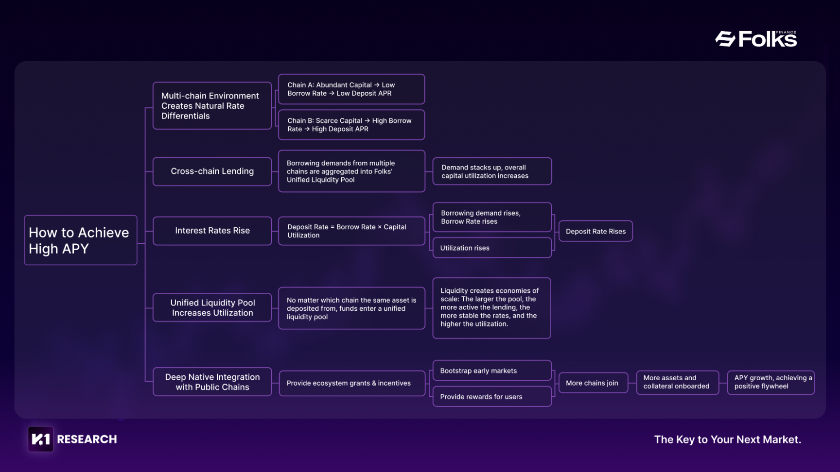 当某条链出现更高的借贷需求或更优的利率时,其他链的闲置资金可以即时补位,使整体资金在更高收益区间内持续运转。相比只能依赖本链供需的传统借贷协议,这种跨链调度让 Folks 的利用率天然更高,也更不容易因为单链周期变化而出现利率下滑。