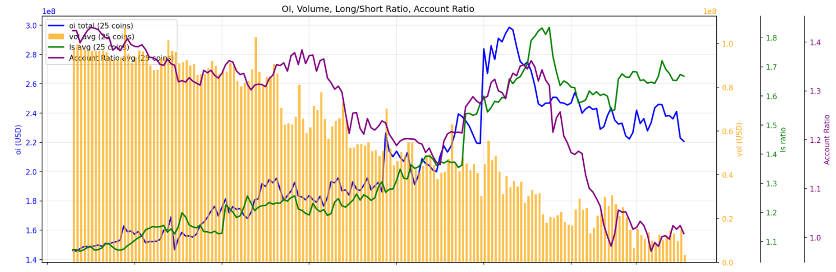 OI 总体从 6 亿美元上升至 16 亿美元,而成交量自高位回落,表明资金正在进入低频控盘状态。