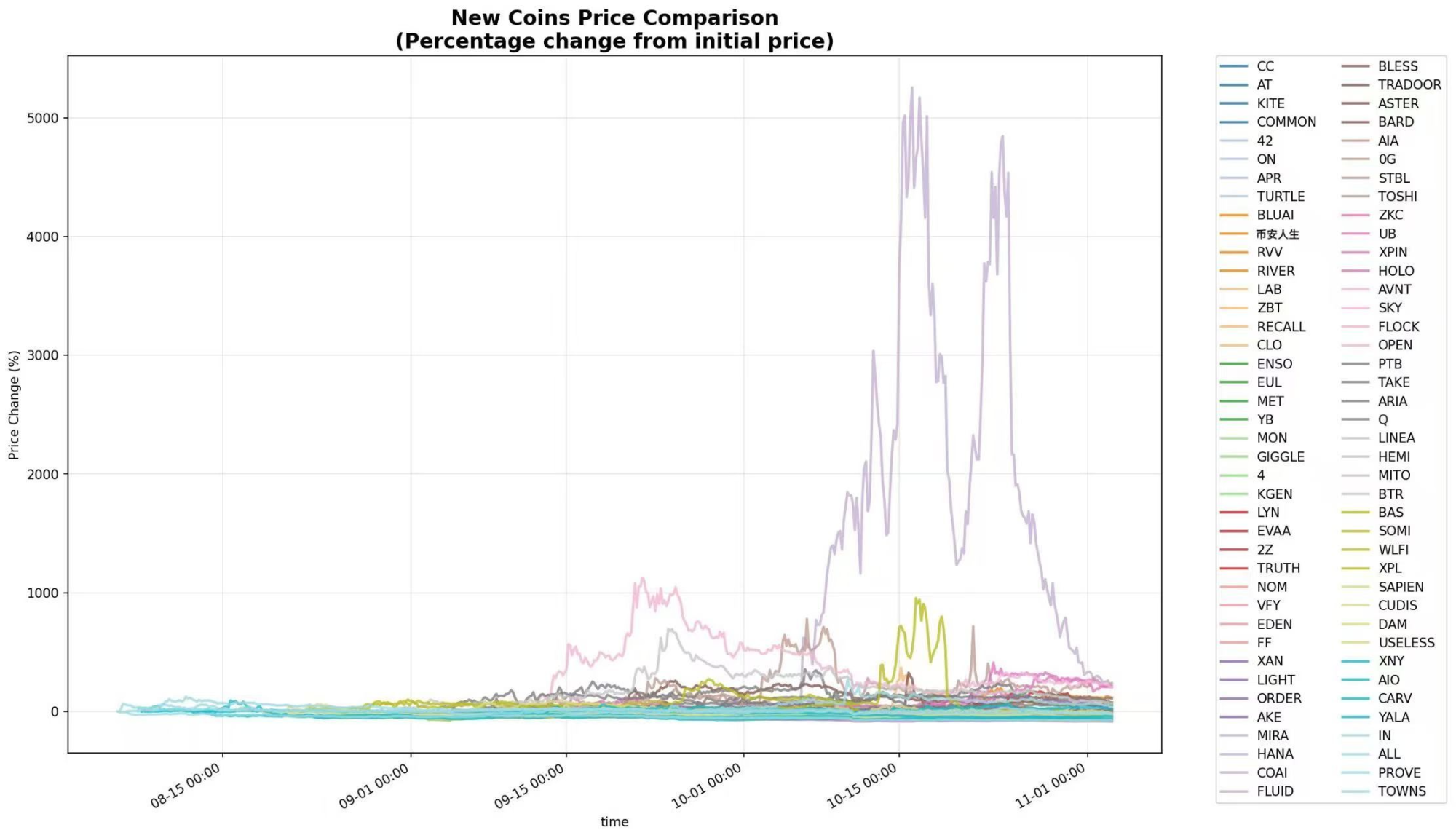 这种「集中上新」现象,本质上是一次对市场承接力与热点扩散效率的测试。对比前两个月的数据可以看出,10 月市场进入了一个明显的「合约密集期」。然而,从价格表现来看,多数新合约在首周冲高后迅速回落,整体平均跌幅较大,仅有少数强势币逆势走高,体现出主力与交易员之间的共识分歧与博弈加剧。