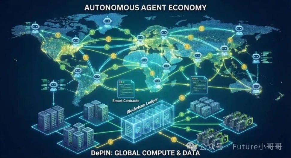 去中心化物理基础设施网络(DePIN)的协同: AI 的运行需要消耗大量的算力(GPU)与数据。通过 DePIN 网络(如 io.net, Render),AI Agent 可以直接租用全球闲置的个人或企业算力,并用 Token 实时结算。这一定程度上打破了中心化云服务商(AWS, Google Cloud)的垄断,降低了 AI 的运行成本,同时也为区块链提供了真实的效用场景(但项目方与参与方初始的算力来源,很可能还是来自最初的巨头,只是后续的租赁可以进行自主的选择来拆散绝对的垄可以预见,在人类用户进行日常移动支付的同时,AI 智能体将在后台的链上网络中自动完成海量的价值交换,形成一个庞大而高效的影子经济体。