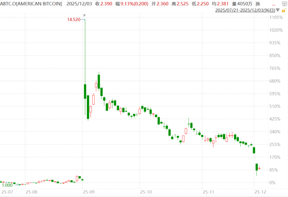 本周二,加密矿企 American Bitcoin 上午 9 点 31 分,也就是开盘仅一分钟后,其股价便暴跌 33%。恐慌情绪迅速蔓延,5 分钟后跌幅扩大至 42%,到上午 9 点 56 分,股价已「腰斩」,跌幅超过 50%。