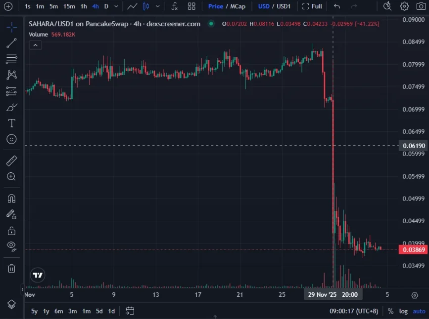 11 月 29 日晚,Sahara AI 的代币 SAHARA 短时间内跌幅超过 50%,价格此后也未能明显修复,现报 0.03869 美元。