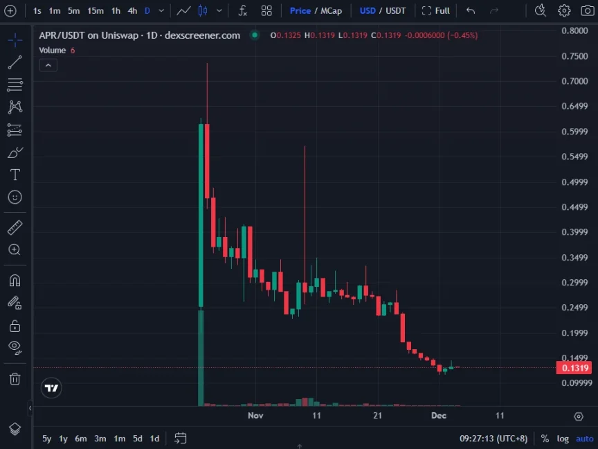 aPriori 是 Monad 生态高融资项目,其代币 APR 在 Monad 主网上线前就选择在 BNB Chain 「提前」 TGE 。10 月 23 日,APR 上线币安 Alpha 与币安合约,开盘一度冲上 0.7 美元以上,但随后一路下行,目前已跌至 0.13 美元。开盘后价格疲弱本已让社区心有疑虑,而真正的引爆点出现在几周之后。