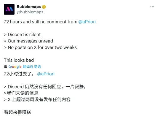 然而,比数据本身更让社区不满的是——项目方完全不回应。11 月 14 日,Bubblemaps 表示他们早已联系 aPriori 团队,寻求就「60% 空投被同一实体通过 1.4 万个地址领取」的情况给出解释,但截至目前仍未收到回应。
