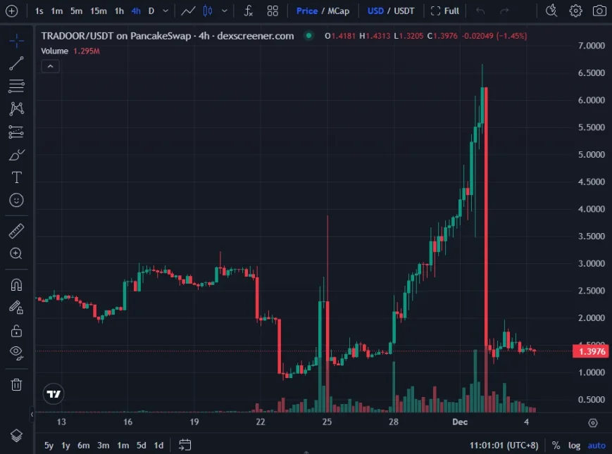 币安 Alpha 项目 Tradoor 其代币 TRADOOR 12 月 1 日冲至历史新高 6.64 美元,但在接下来的 24 小时内急速下跌,暴跌近 80%,跌至 1.47 美元;目前价格报 1.39 美元。