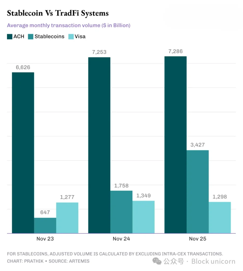 过去三年,经调整后的稳定币交易量已从落后于 Visa 跃升至 Visa 的 2.5 倍左右,并从 ACH 交易量的一小部分增长到接近其一半。
