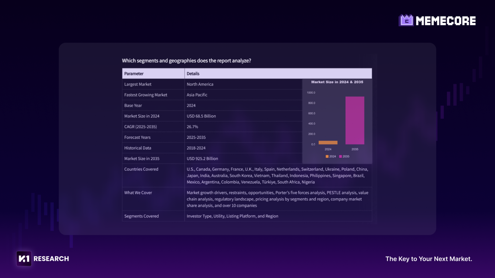根据 MetaTech Insights 的研究,2024 年 Meme 币市场总市值约为 685 亿美元。更为重要的是,该机构预测到 2035 年,市场规模可能增长至约 9,252 亿美元,年复合增长率(CAGR)约为 26.7%——这一增速远超传统加密资产类别。