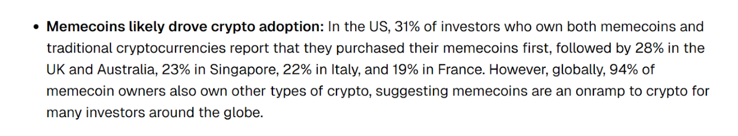 规模之外,用户结构的变化更值得关注。根据 Gemini 2025 年报告,在美国、英国、澳大利亚等地区,高达 31% 的加密货币持有者是先购买 Meme 币,随后才转向其他加密资产。