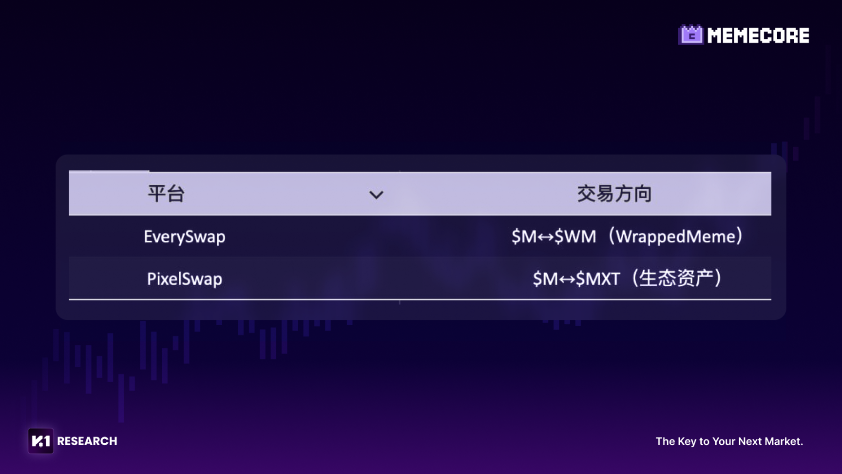 MemeX 所发行的资产原生属于 MemeCore 生态,可直接进入 PixelSwap/EverySwap(现货层),并最终流向 MemeMax(衍生品层)