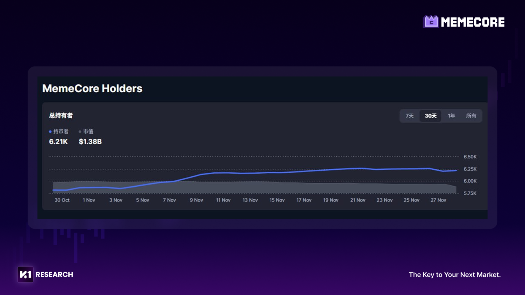 第三,如果生态没有真实用户,只是刷量或机器人参与,价格在热度过后会快速崩盘且链上数据会同步下降。但即使在 11 月下旬的市场调整期,MemeCore 的持币地址依然稳定在 6.21k、每日活跃钱包依然保持在 2-3k,说明用户是真实的。