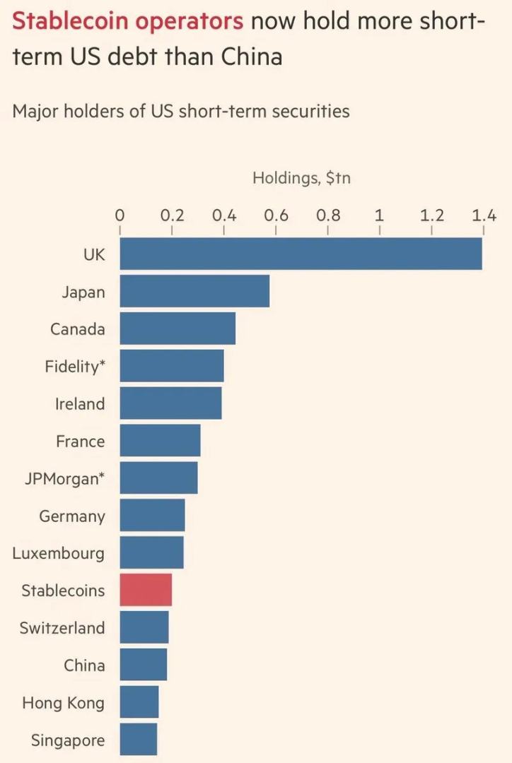 最关键的转变或许在财政部。前财长珍妮特·耶伦曾将稳定币视为系统性风险。而现任财长斯科特·贝森特,一位具有对冲基金思维的官员则看到了本质:稳定币发行商是美国国债「唯一的新增净买家」。