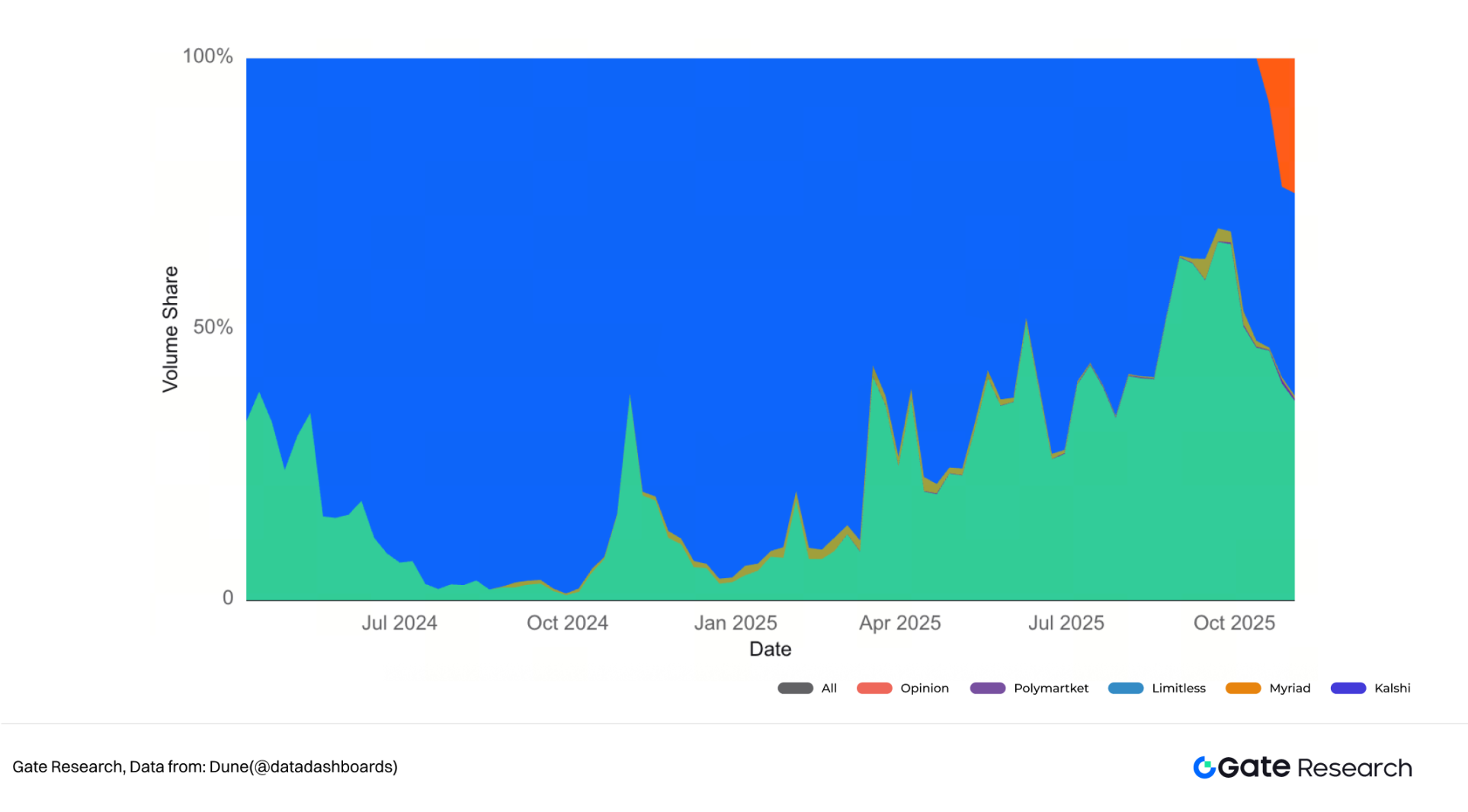 Polymarket 在事件预测的发展上较为均衡,以政治、体育和 Crypto 为主,文化和电子体育 Esports 也在快速崛起。这表明了 Polymarket 在不同类型的事件上都证明了其价值,用户群体从加密原生圈层加速向不同圈层的主流视野扩张。不同类型的事件会带来不同使用习惯和需求的新用户,仅仅只是单一的、面向 Crypto Native 用户的产品界面显然无法满足所有人。市场内部自发地会出现需求分层,这为专注于特定事件类型或不同特点的用户群体的垂直前端创造了巨大的市场机会,吸引外部开发者入场填补空白。