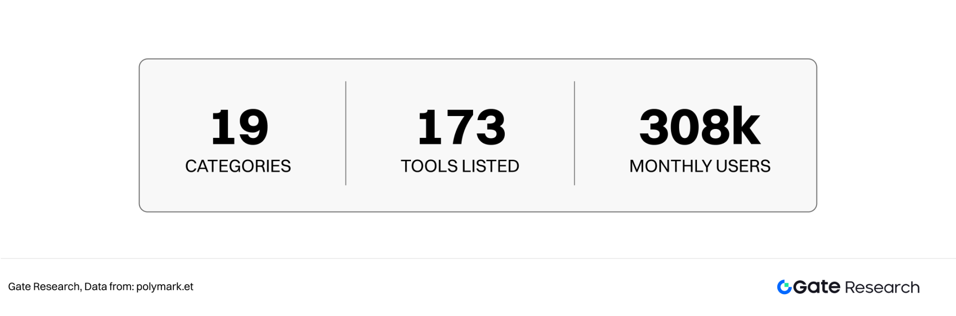 中间层连接着偏向于底层的基础设施与用户 -facing 应用,丰富了生态的数据和交互能力。Polymarket 已经诞生了一系列数据分析工具,如官方的 Polymarket Analytics、一站式分析 Polysights、鲸鱼追踪工具 PolyInsider 等,将链上原始数据转化为可供决策的洞察。在社区支持的 Polymark et 网站上对 Analytics Tools、Portfolio Tracking、Dashboards 等工具进行了 19 种类型划分,收录了超过 170 个工具。