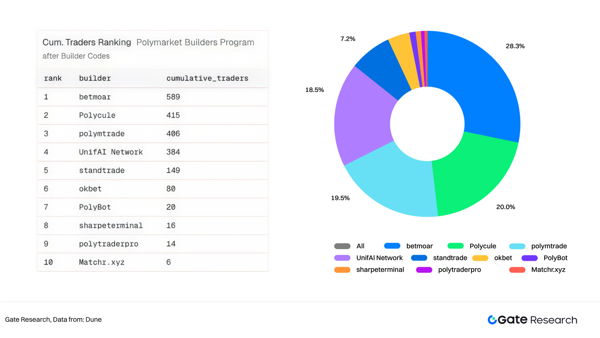 在 Polymarket 多样化的生态图谱中,Trading Bots 交易无疑是当前发展最成熟、模式最清晰的一环。Builder Codes 的推出,可以说正是为这类前端应用量身打造的新的增长引擎。目前 10 余个 Polymarket Builders 每周交易量可达超过 2,000 万美元,约占 Polymarket 的 2.5%,其中 Betmoar 成为首个 Builder Codes 推出约一个月以来累积交易量超过 5,000 万美元的 Trading Bots,占据着超 70% 的市场份额。