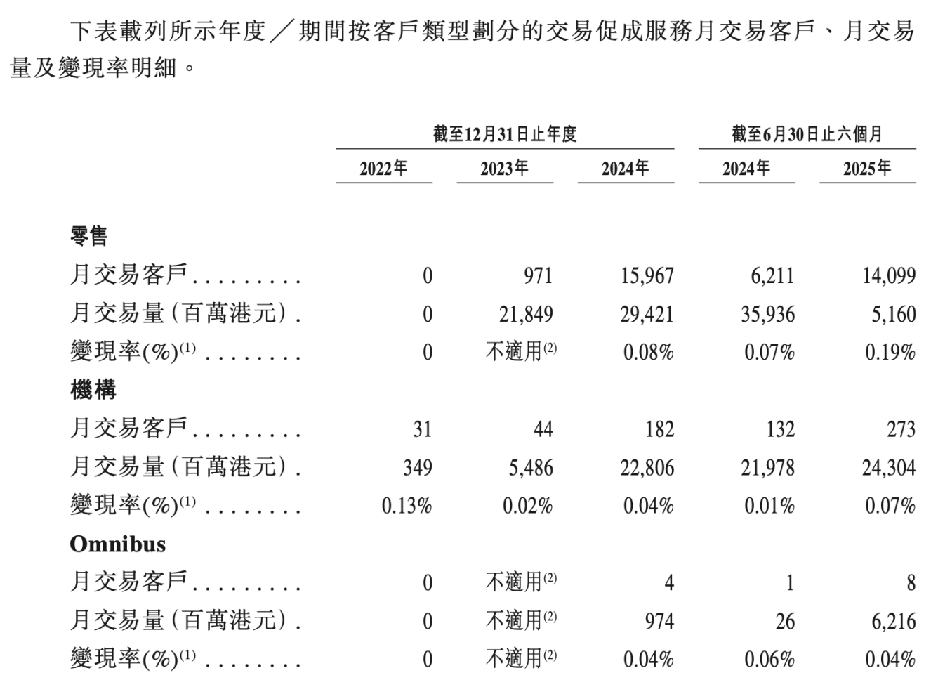 但这种依赖也让其业绩与市场周期深度绑定。2024 年牛市期间,其收入同比激增 247%;2025 年上半年市场低迷,交易量从去年同期 3476 亿港元骤降至 2141 亿港元,收入随之同比下降 26%。更值得关注的是零售客户的高敏感度:2025 年上半年零售客户月交易量与同期相比从 359.36 亿港元跌至 51.6 亿港元,降幅超 85%,而机构客户月交易量则由 219.78 亿港元增长至 243.04 亿港元,成为市场波动中的「稳定器」。这揭示出零售投资者是市场情绪「放大器」,牛市蜂拥入场,熊市快速离场,也让平台面临「靠天吃饭」的风险。