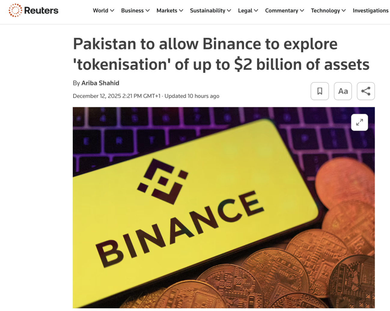 * 巴基斯坦与币安签署谅解备忘录,探讨 20 亿美元国有资产代币化。
