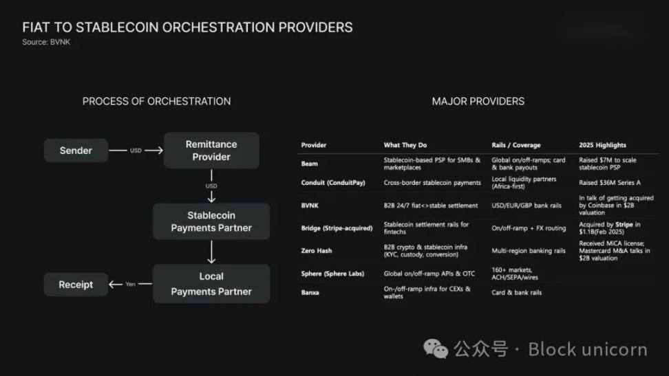 非洲最大的加密货币支付通道公司 Yellowcard 已成为一个区域枢纽,能够将稳定币与当地货币连接起来,并完全符合各国的监管规定。被 Stripe 以 11 亿美元收购的 Bridge 也扮演着类似的角色。像 Zero Hash 和 BVNK 这样的公司——据报道,万事达卡和 Coinbase 正在考虑以约 20 亿美元的价格收购它们——现在为企业、交易所和金融科技平台提供后端基础设施,从而实现稳定币的大规模实际应用。