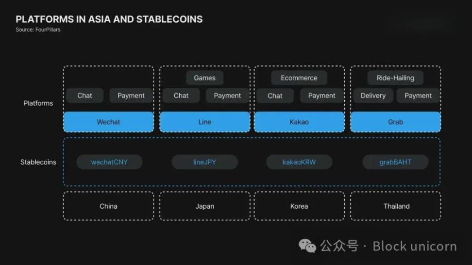IT 平台是日常消费者活动和企业运营的集中地,正成为扩展稳定币应用的最强大枢纽。亚洲的「超级应用」融合了即时通讯、购物、支付和金融服务,其(非加密货币)数字钱包已经创造了巨大的用户活跃度和交易量。通过内部集成稳定币,这些平台可以构建自己的原生金融生态系统,并显著提升用户参与度。