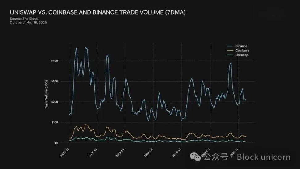来源:Uniswap 与 Coinbase 和 Binance 交易量对比(7 日均线)