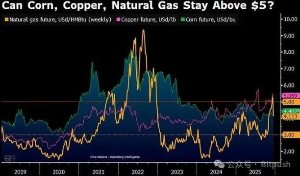 他指出,到 2026 年前后,大宗商品价格可能会围绕一个关键中轴波动——天然气、玉米、铜等核心商品的「通胀—通缩分界线」或落在 5 美元附近,而在这些商品中,只有铜这种具备真实工业需求支撑的资产,才可能在 2025 年结束时仍站在该中轴之上。