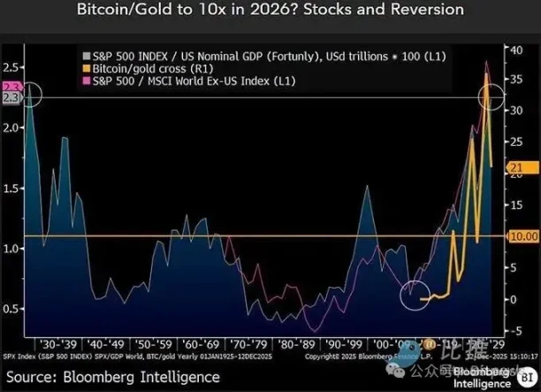 其次,是比特币与黄金之间的相对定价关系。McGlone 特别强调比特币 / 黄金比值这一指标。该比值在 2022 年底约为 10 倍,随后在牛市推动下快速扩张,并在 2025 年一度达到 30 倍以上。但今年以来,这一比值已回落约 40%,降至 21 倍附近。在他看来,如果通缩压力持续、黄金因避险需求而保持坚挺,那么比值进一步回到历史区间,并非激进假设。