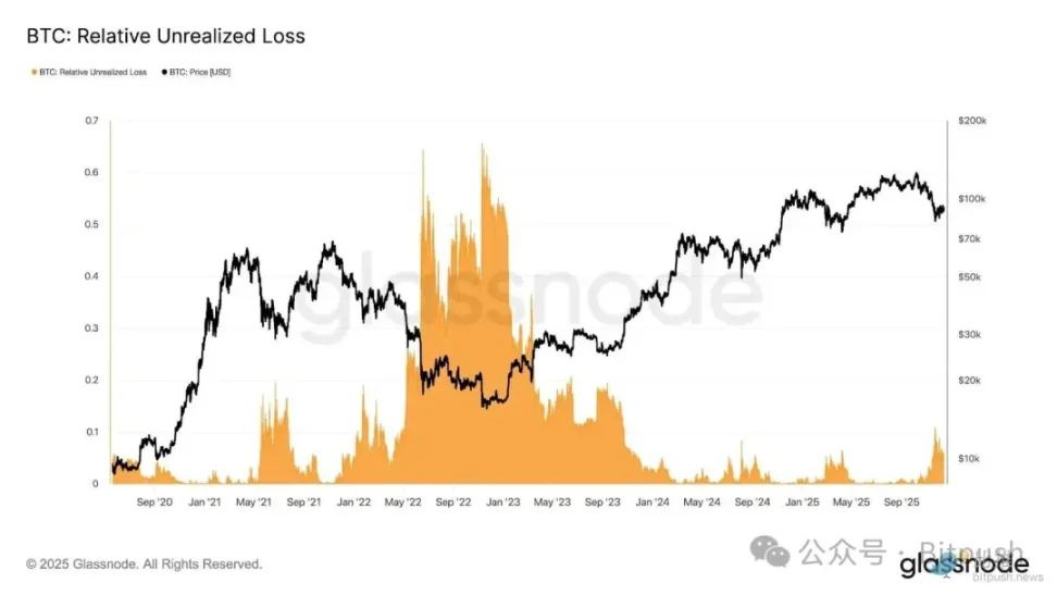Glassnode 的研究指出,目前比特币在 8 万至 9 万美元的震荡区间已引发市场承压,其压力强度堪比 2022 年 1 月底的走势。当前市场的相对未实现亏损已逼近市值的 10%。分析师进一步解释,这样的市场动态反映出当前处于一种 「流动性受限、对宏观冲击敏感」 的状态,但仍未达到典型熊市彻底抛售(恐慌性割肉) 的水平。